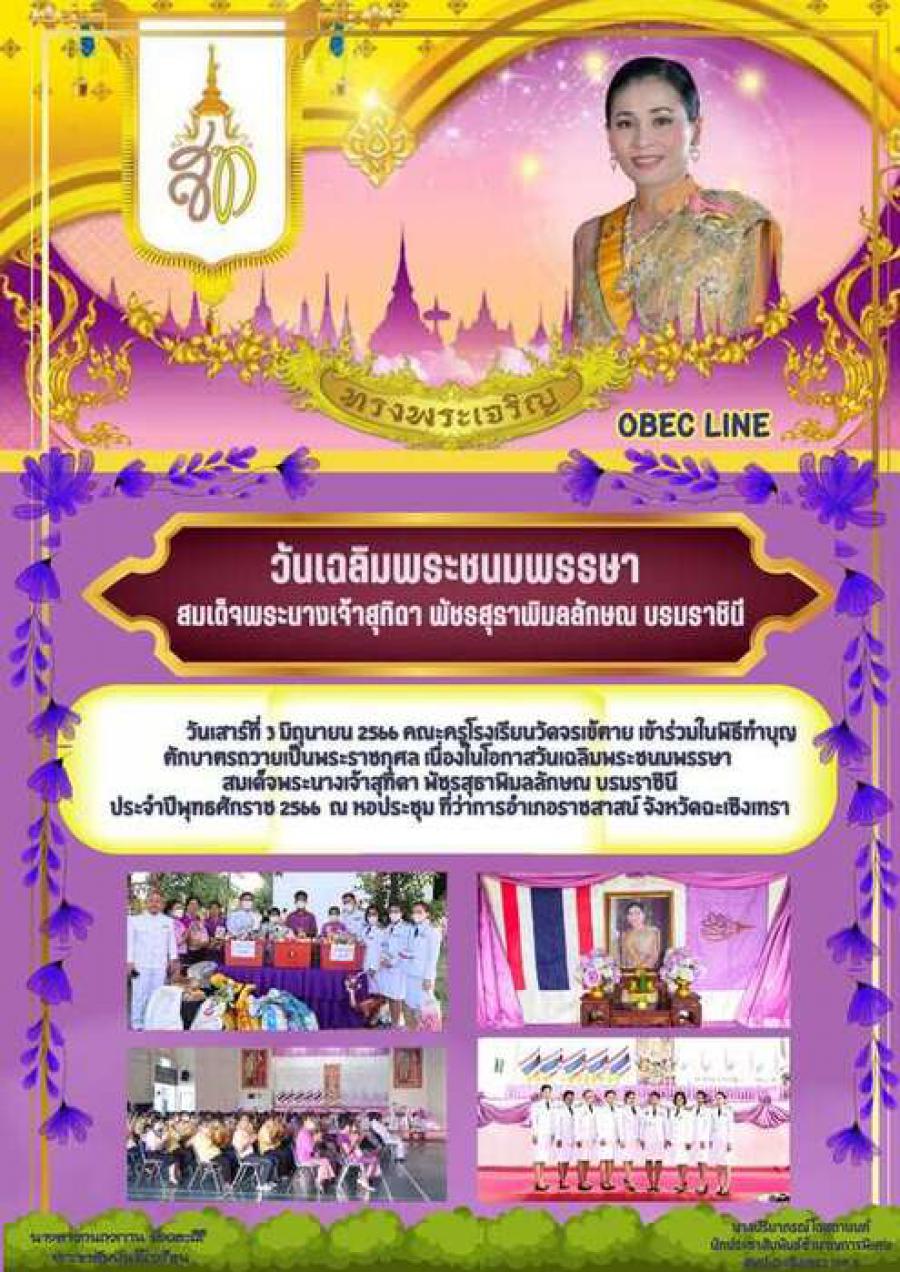 วันเสาร์ที่ 3 มิถุนายน 2566 คณะครูโรงเรียนวัดจรเข้ตาย เข้าร่วมในพิธีทำบุญตักบาตรถวายเป็นพระราชกุศล เนื่องในโอกาสวันเฉลิมพระชนมพรรษา สมเด็จพระนางเจ้าสุทิดา พัชรสุธาพิมลลักษณ บรมราชินีประจำปีพุทธศักราช 2566 ณ หอประชุม ที่ว่าการอำเภอราชสาสน์ จังหวัดฉะเชิงเทรา S:0